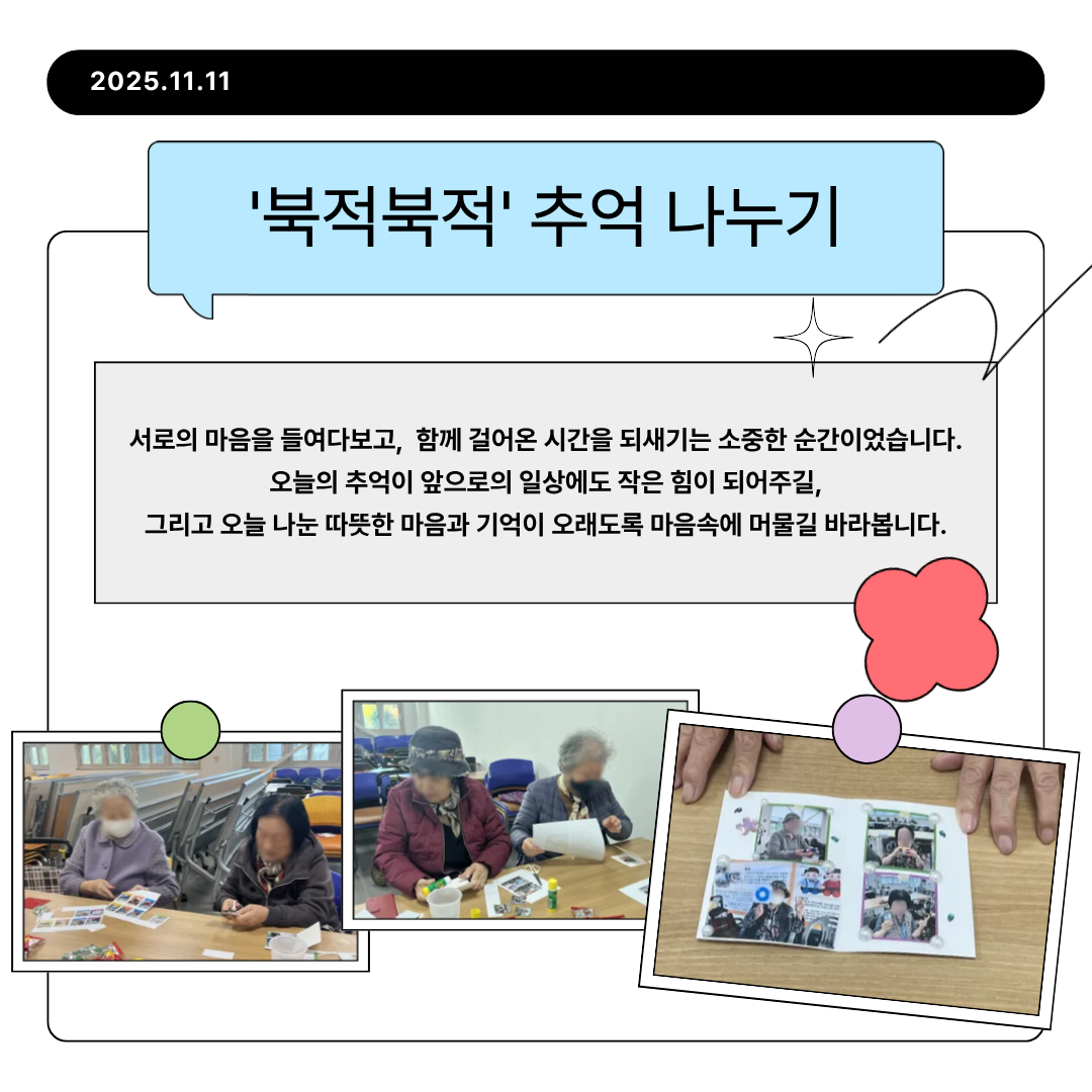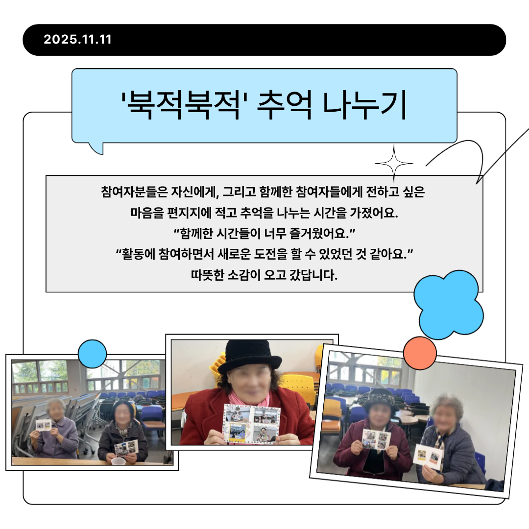 <일상생활 활력지원사업 ‘추억 나누며 사진 꾸미기' > 🌸그동안의 활동 사진을 함께 보며 이야기꽃을 피우고, 마음에 드는 사진을 오려 붙인 뒤 스티커와 형광펜으로 예쁘게 꾸미는 시간을 가졌습니다.🌷✨ 참여자분들은 자신에게, 그리고 함께한 참여자들에게 전하고 싶은 마음을 편지지에 적고 추억을 나누는 시간을 가졌어요.💌