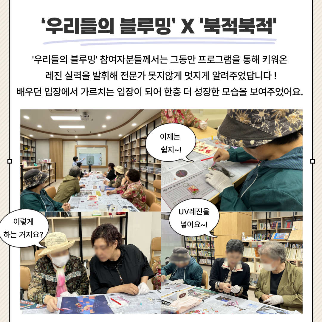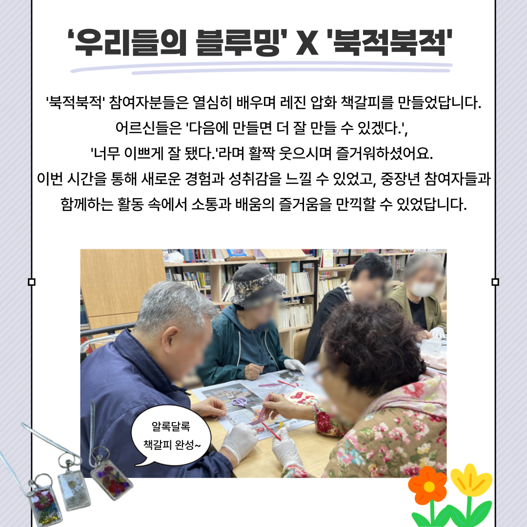🌸 오늘은 ‘우리들의 블루밍’ 참여자들이 ‘효도인형’ 어르신들과 함께 레진 압화 책갈피를 만들었어요!